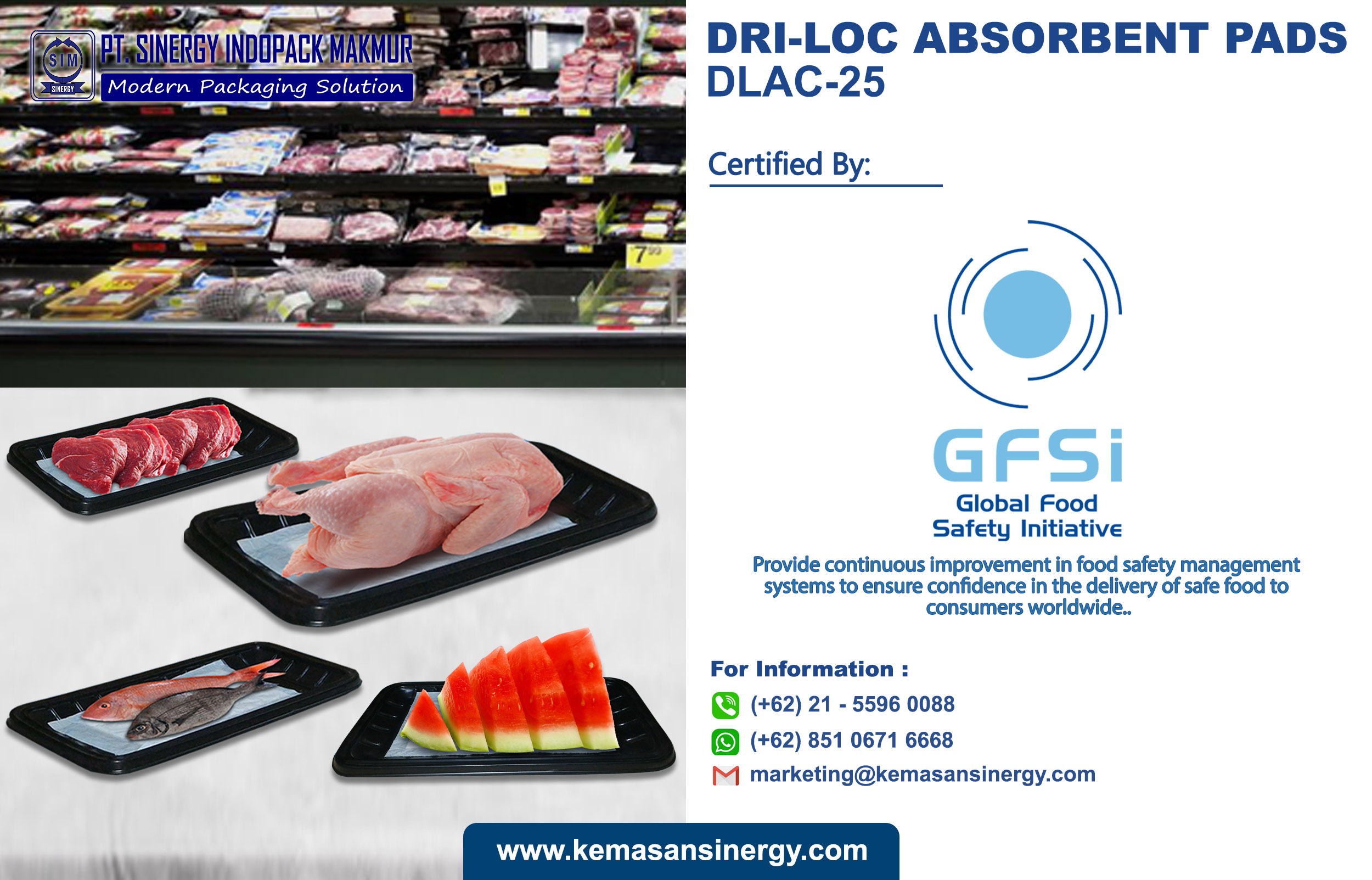 DRI-LOC Super Absorbent Pads DLAC-25 adalah lembaran berbentuk bantalan tipis persegi panjang berwarna putih memiliki dua sisi permukaan yang berbeda, Dengan sisi atas (tercetak) dan sisi lainnya di bagian bawah (polos) yang memiliki pori pori untuk menyerap cairan yang keluar dari produk makanan.